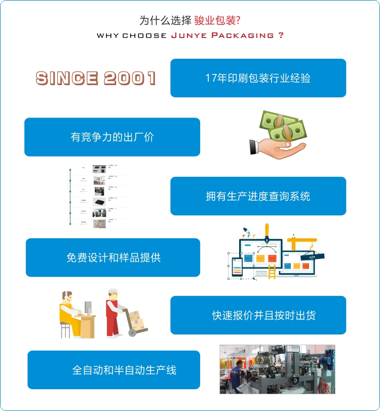 廣州駿業(yè)包裝實業(yè)有限公司創(chuàng)建于 2001年,是一家以印刷包裝制品為主營業(yè)務(wù)的集設(shè)計、生產(chǎn)、銷售為一體的一般納稅企業(yè),主要生產(chǎn)各種精品包裝盒、紙袋、吊牌,其主要應(yīng)用于服飾、皮具、化妝品、保健品、禮品、首飾、茶葉、酒類、電子產(chǎn)品及其它日用制品等行業(yè),并通過了德國萊茵認證、BV認證、SGS認證和WCA認證.
