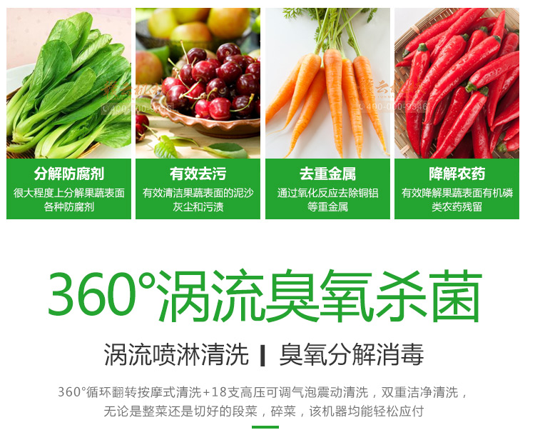 也是用于對(duì)蔬菜的清洗工作,可以對(duì)完整的或者切割過的菜進(jìn)行旋渦臭氧雙重清洗,達(dá)到快速清洗的效果。